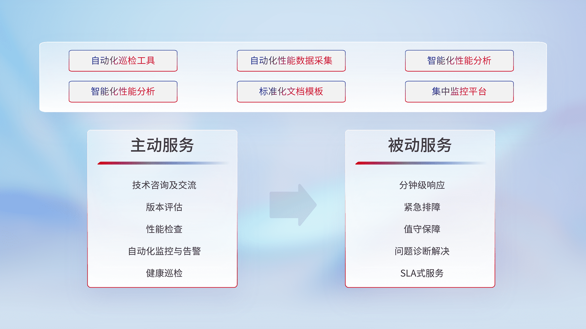 智能化工具和标准化文档,,保障服务质量,,,,提供主动服务(包含技术咨询、、、、版本评估、、性能检查、、、、自动化监控与告警、、健康巡检)和被动服务包含(分钟级响应、、紧急排障、、、值守保障、、问题诊断解决、、SLA服务)。。。。